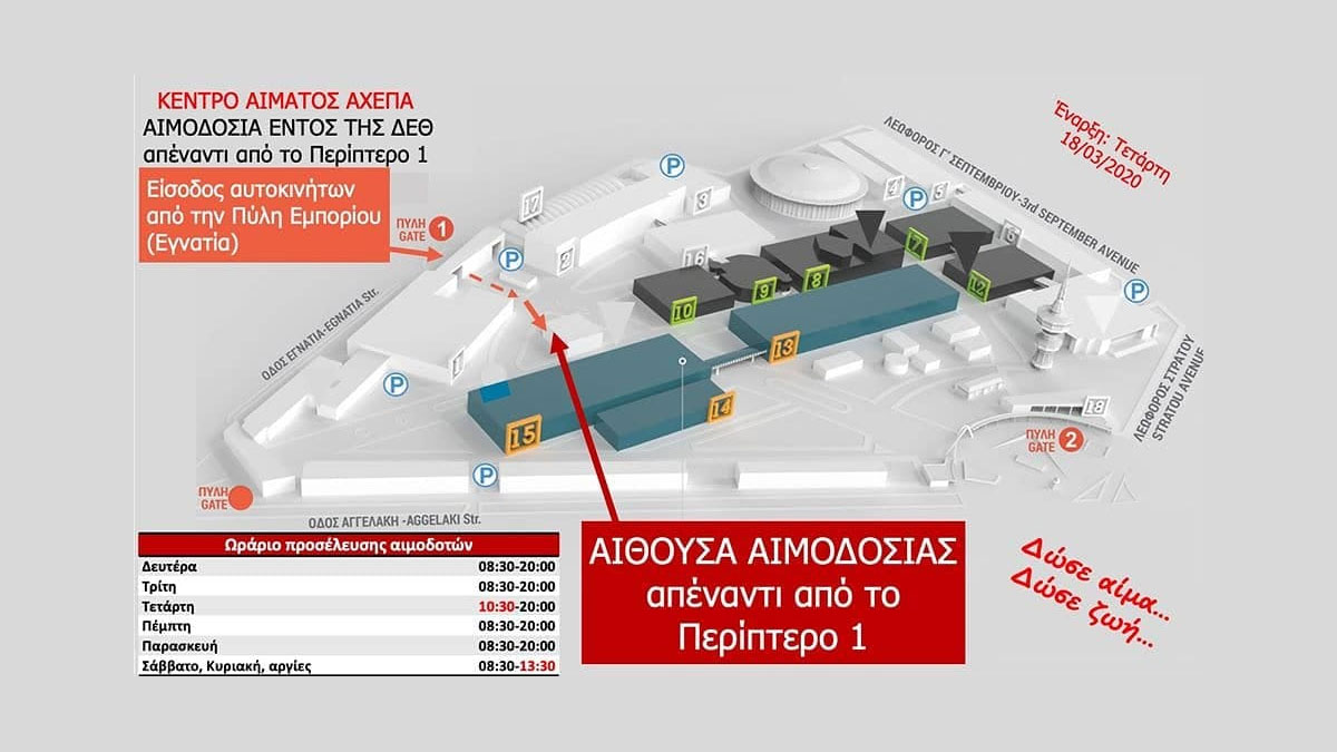 📝 Με τα αποθέματα αίματος να στερεύουν επικίνδυνα και για λόγους καλύτερης εξυπηρέτησης, από την Τετάρτη 18 Μαρτίου 2020, στην Αίθουσα Αιμοδοσίας, που λειτουργεί εντός της Διεθνούς Έκθεσης Θεσσαλονίκης, θα ισχύει το παρακάτω ωράριο προσέλευσης αιμοδοτών: