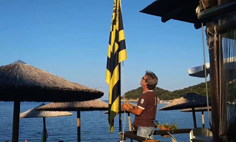 Ο Φάνης, γνωστός στην περιοχή για τα «κιτρινόμαυρα» αισθήματα του, καθημερινά και για όλο το καλοκαίρι κάνει έπαρση της σημαίας του Άρη συνοδευόμενη από γνωστά συνθήματα της ομάδας (θυμηθείτε εδώ)