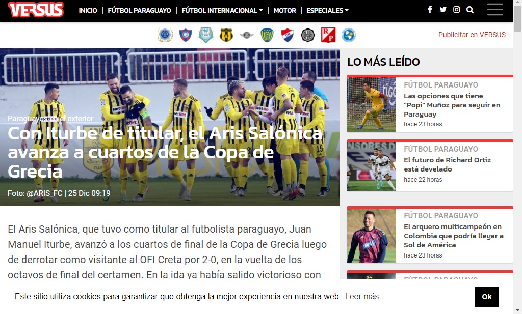 “Ο Άρης Θεσσαλονίκης, που είχε ως βασικό τον Παραγουανό ποδοσφαιριστή Χουάν Μανουέλ Ιτουρμπέ, προκρίθηκε στα προημιτελικά του Κυπέλλου Ελλάδος, αφού νίκησε ως φιλοξενούμενος τον ΟΦΗ Κρήτης με 2-0, στον δεύτερο αγώνα της φάσης των 16 της διοργάνωσης. Στο πρώτο ματς είχε ήδη βγει νικητής με ηχηρό 3-1” αναφέρει μεταξύ άλλων η Versus.