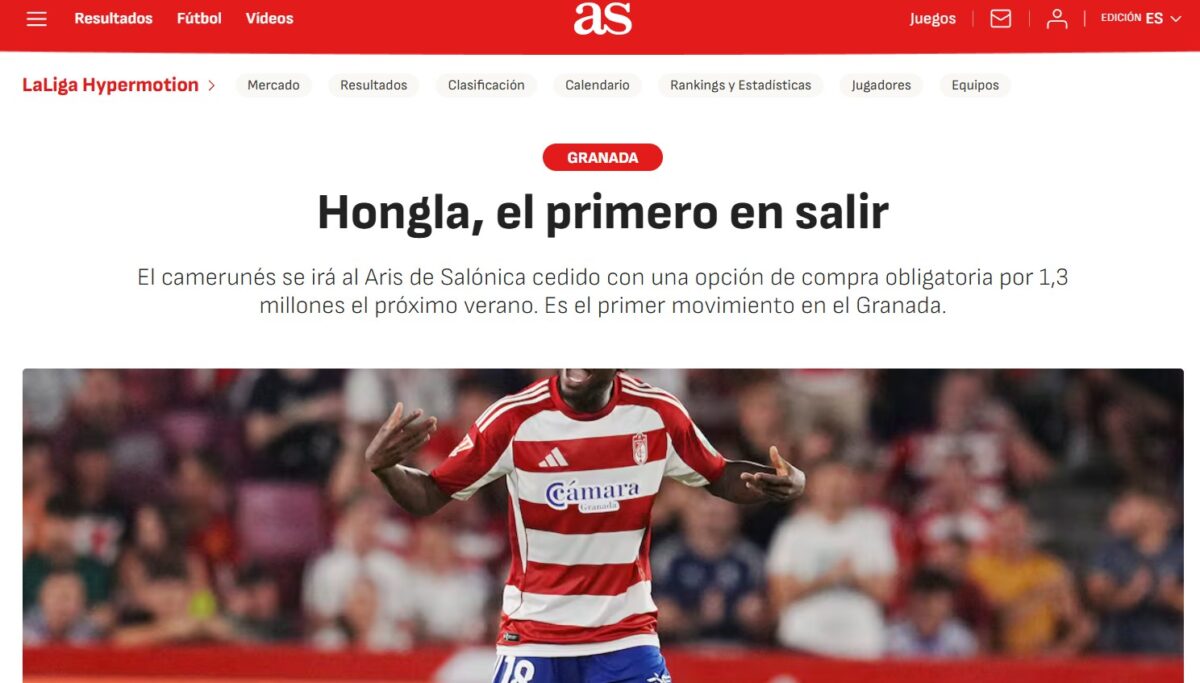 “Ο χωρισμός του Μάρτιν Χόνγκλα από την Γρανάδα είναι πλέον επίσημος. Ο Καμερουνέζος μέσος πηγαίνει στον Άρη Θεσσαλονίκης με τη μορφή δανεισμού, αλλά και με υποχρεωτική οψιόν αγοράς ύψους 1,3 εκατομμυρίων ευρώ, που εγγυάται ότι οι δρόμοι τους δεν θα ξανασυναντηθούν”, αναφέρει μεταξύ άλλων.