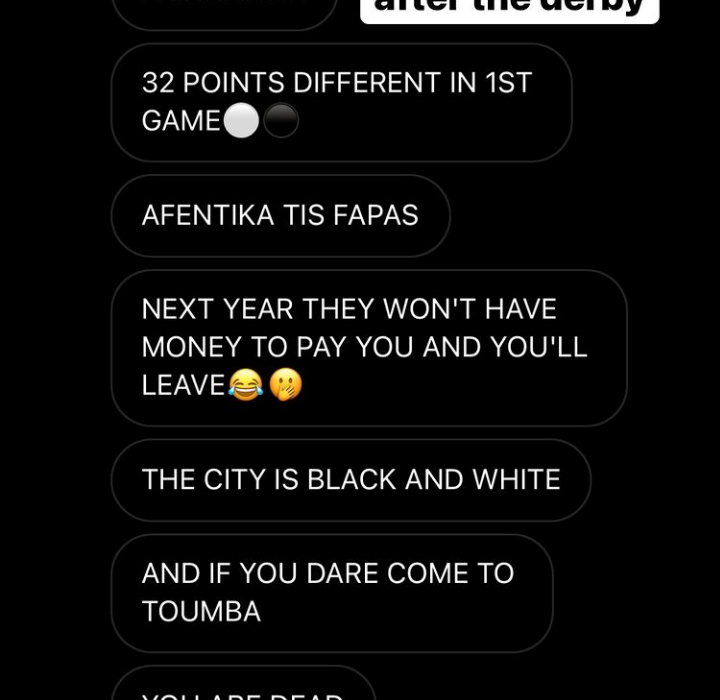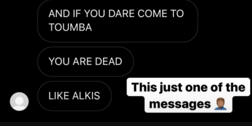 Ένα μόνο από τα μηνύματα τα οποία στάλθηκαν μοιράστηκε ο ίδιος μέσα από τα social media, με το περιεχόμενο του να είναι φρικιαστικό. «Αν το τολμήσεις να έρθεις στην Τούμπα θα πεθάνεις, όπως ο Άλκης» του έγραψε οπαδός (προφανώς) του ΠΑΟΚ στο instagram.