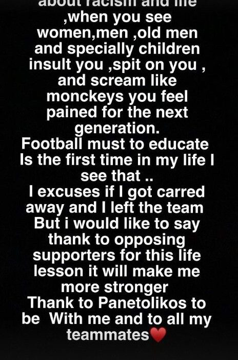 “Έμαθα πολλά σήμερα για τον ρατσισμό και την ζωή. Όταν βλέπεις γυναίκες, άνδρες, ηλικιωμένους, ακόμα και παιδιά να σε προσβάλλουν, να σε φτύνουν και να ουρλιάζουν σαν μαϊμούδες νιώθεις λύπη για την επόμενη γενιά. Το ποδόσφαιρο πρέπει να εκπαιδεύει, είναι η πρώτη φορά που ζω κάτι τέτοιο.