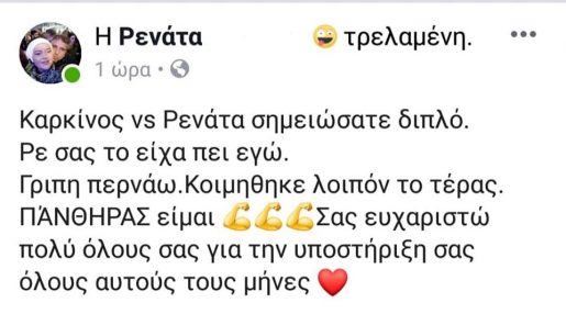 Η Ρενάτα ενημέρωση μέσω του facebook τον κόσμο που την στήριξε λέγοντας ότι “Κοιμήθηκε το τέρας”.