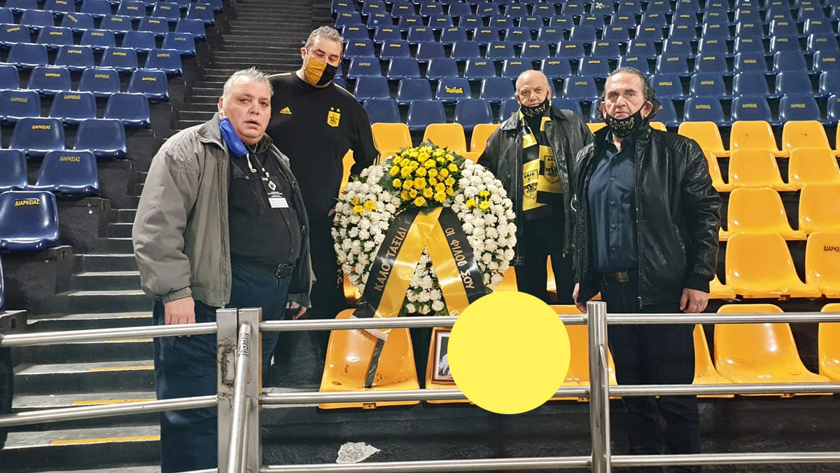 Στεφάνι στην μνήμη του Δημήτρη Μαυροχωρίδη κατέθεσαν οι φίλοι του, στη θέση του στο Παλέ, πριν το τζάμπολ της αναμέτρησης Άρης-Κολοσσός.