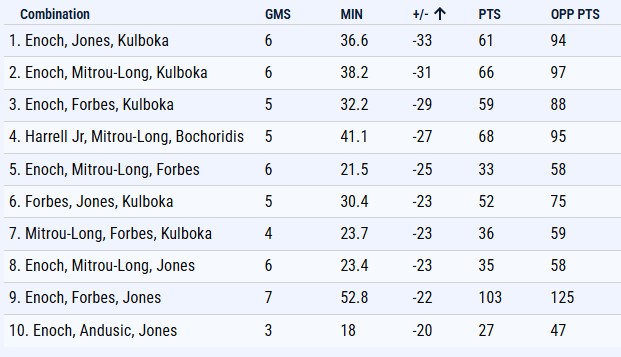 Αφού τα παραπάνω είναι λίγο πολύ γνωστά, να πάμε κάπου αλλού. Το πόσο σημαντικός είναι ο Νουά για την ομάδα φαίνεται στον παρακάτω πίνακα. Αυτός αφορά τις χειρότερες «τριάδες» του φετινού Άρη. Στις 10 χειρότερες συναντάμε πολλές φορές τα ονόματα των Ίνοχ (7), Κουλμπόκα (5), Τζόουνς (5), Μήτρου Λονγκ (5).