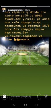 Λίγο αργότερα, έγραψε στο Instagram: “Δεν κέρδισε η Molde στο πρώτο παιχνίδι, ο Άρης έχασε. Δεν γίνεται με αυτό που είδα σήμερα στην προπόνηση να χάσουμε ποτέ. Δεν υπάρχει καμία περίπτωση. Δεν γλιτώνουν. Together we rise. Vamos”.