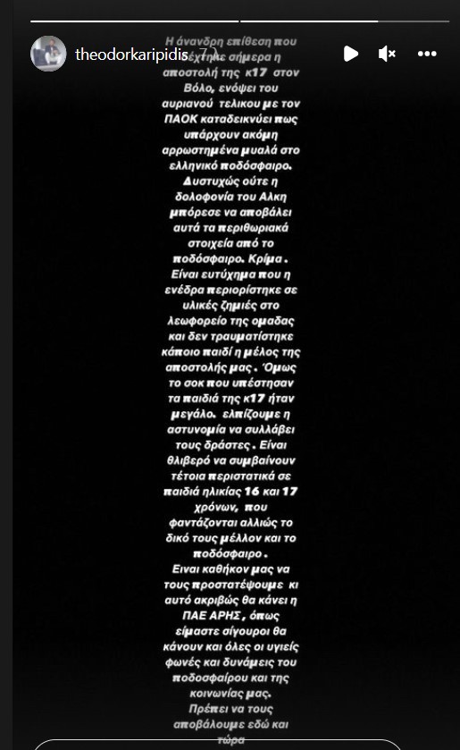 Ξέσπασε ο ισχυρός άνδρας της ΠΑΕ Άρης, παίρνοντας θέση για το περιστατικό με τις πέτρες στο πούλμαν της αποστολής της Κ17 των κιτρινόμαυρων στο Βόλο.