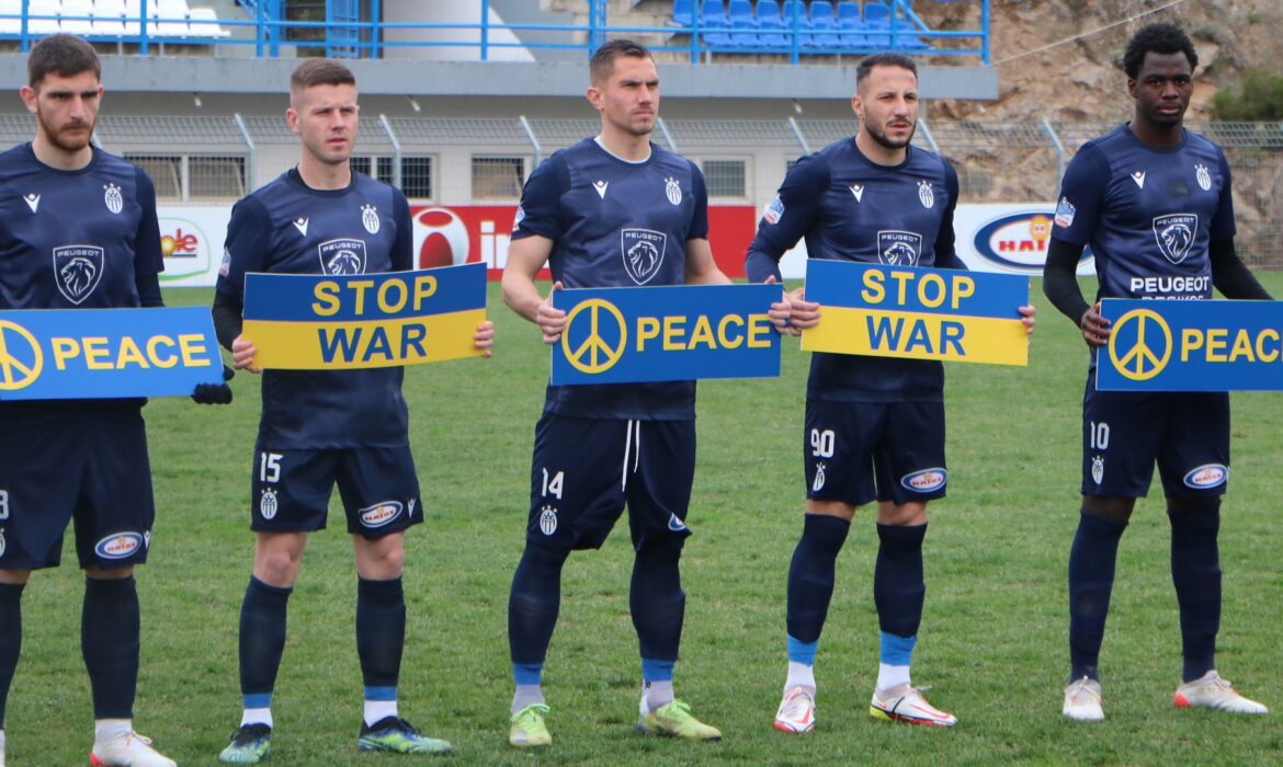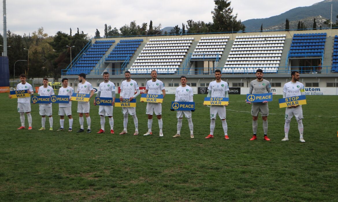 Πριν την έναρξη του αγώνα Κηφισιά-Ρόδος για την 13η αγωνιστική της Super League, οι παίκτες των συλλόγων, σήκωσαν πλακάτ που απεικόνιζαν την ουκρανική σημαία και τις φράσεις “peace” και “stop war”.