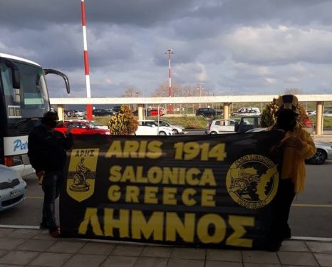 Με σύνθημα  ”Ούτε στην Λήμνο θα είσαι μοναχός, γιατί Άρη μου δεν γίνετε αλλιώς”, φίλοι της ομάδας από το νησί υποδέχθηκαν την αποστολή στις οκτώ το πρωί στο τοπικό αεροδρόμιο για την συνοδεύσουν μέχρι το ξενοδοχείο, αλλά και να δείξουν την στήριξη τους.
