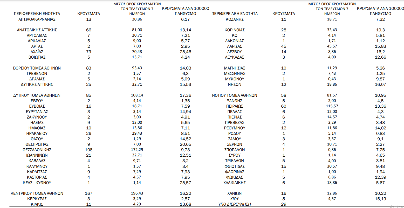 Αναλυτικά η γεωγραφική κατανομή των 1.165 κρουσμάτων της Δευτέρας: