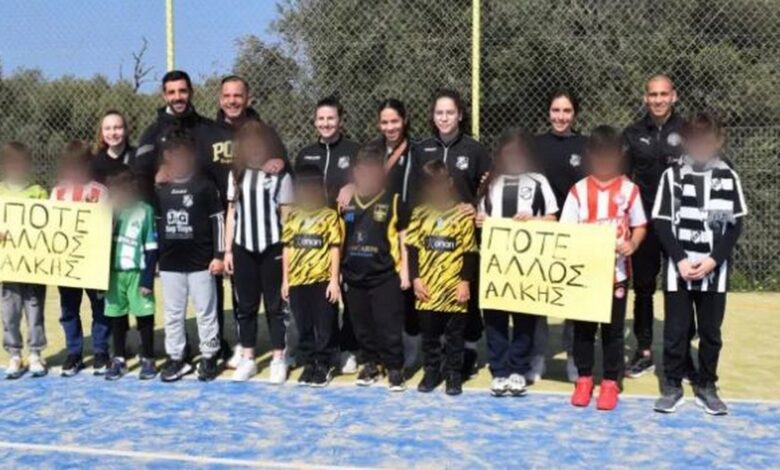 Οι μαθητές και οι μαθήτριες φορούσαν τη φανέλα της αγαπημένης τους ομάδας και κρατούσαν πλακάτ με το μήνυμα “ποτέ άλλος Άλκης”, τιμώντας έτσι τη μνήμη του αδικοχαμένου Άλκη Καμπανού και στέλνοντας μήνυμα κατά της βίας.
