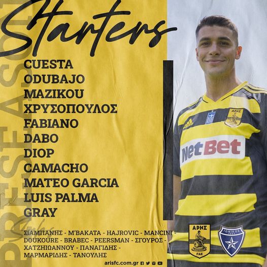 Στην επίθεση θα βρίσκεται ξανά ο Γκρέι. Ουσιαστικά, ο Άρης θα αγωνιστεί με 4-2-3-1. Αναλυτικά η 11άδα: Κουέστα, Οντουμπάγιο, Μαζικού, Χρυσόπουλος, Φαμπιάνο, Νταμπό, Ντιόπ, Καμάτσο, Γκαρσία, Πάλμα και Γκρέι.
