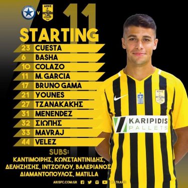 Αναλυτικά οι έντεκα του Άρη: Κουέστα, Μπάσα, Κολάσο, Γκαρσία, Γκάμα, Γιουνές, Τζανακάκης, Μενέντεθ, Σιώπης, Μάβραϊ, Βέλεθ