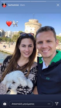 Οι δυο τους φωτογραφήθηκαν με φόντο τον Λευκό Πύργο έχοντας μαζί και το…τρίτο μέλος της οικογένειας τους, το σκυλάκι τους.