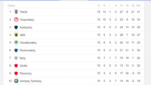 Με την ολοκλήρωση της 16ης αγωνιστικής διαμορφώθηκε η βαθμολογία του πρωταθλήματος.