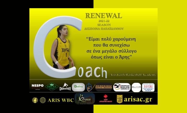 Η Δέσποινα Παπαϊωάννου θα παραμείνει στην Ακαδημία «ARIS Girls Basketball Academy» για την αγωνιστική περίοδο 2021-2022, ως κόουτς των νεαρών αθλητριών του συλλόγου μας.