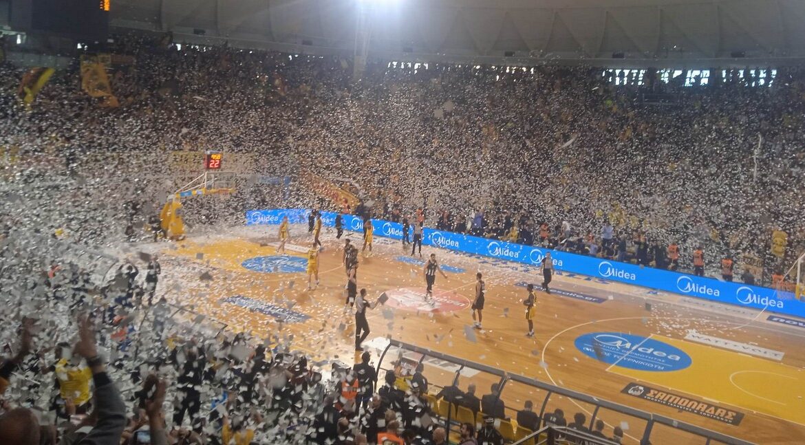 Μια τρελή ατμόσφαιρα στο Παλέ… Με την έναρξη του ντέρμπι υπήρξε διακοπή αφού άπειρα χαρτάκια πετάχτηκαν από τους φίλους του Άρη. Ηταν μια πανέμορφη εικόνα, με τα χαρτάκια να σκεπάζουν το γήπεδο και να επικρατεί… χαμός!