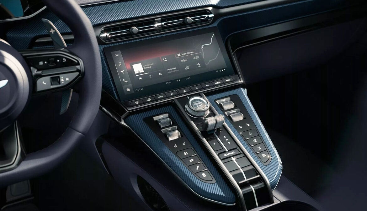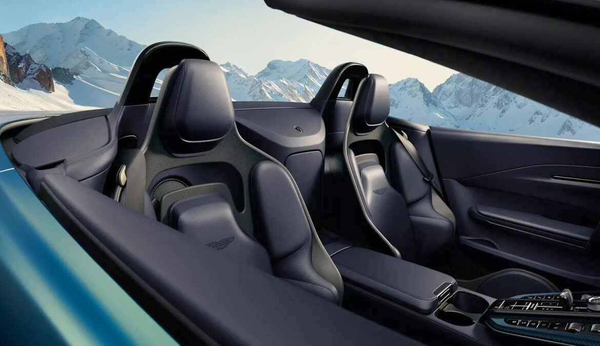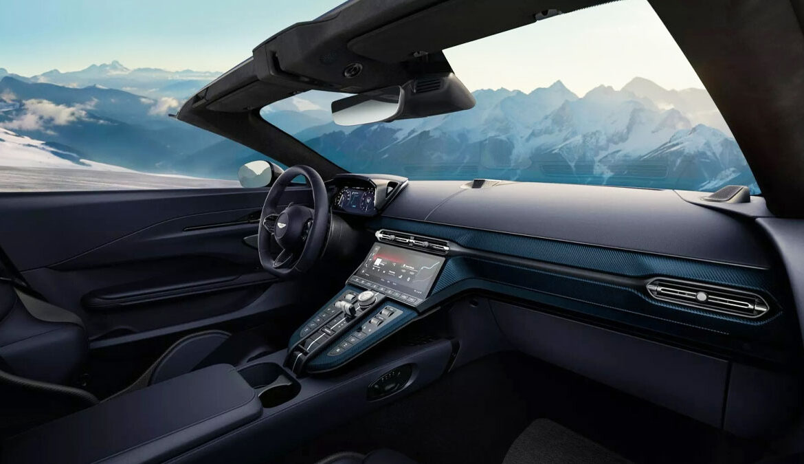 Το εσωτερικό της ανοικτής Vantage προσφέρει πολυτέλεια, τεχνολογία αιχμής και ένα σύστημα infotainment που συνδυάζει οθόνες αφής με φυσικούς διακόπτες. Έρχεται με στάνταρ ηχοσύστημα 11 ηχείων της Aston Martin, ενώ υπάρχει και η επιλογή αναβάθμισης του ήχου από την Bowers & Wilkins.