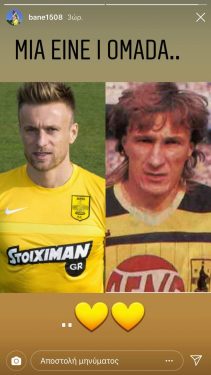 Πάνω από το κολλάζ έγραψε “Μια είναι η ομάδα”, δείχνοντας το δέσιμο της οικογένειας Νίκιτς με την οικογένεια του Άρη. Σε εποχές δύσκολες που πέρασε ο Μπάνε με την ομάδα τώρα είναι εδώ και δεν την αφήνει ούτε στα εύκολα.