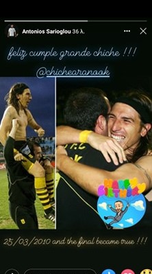 Ο Έλληνας γυμναστής δημοσίευσε δύο φωτογραφίες με τον Αργεντίνο από την περίοδο που βρίσκονταν και οι δύο στον Άρη και πιο συγκεκριμένα από την ημέρα που οι «κιτρινόμαυροι» απέκλεισαν στα ημιτελικά του Κυπέλλου την Καβάλα στις 25 Μαρτίου 2010 και προκρίθηκαν στον μεγάλο τελικό του θεσμού, στις 25/ γράφοντας: «Χρόνια πολλά μεγάλε chiche!»