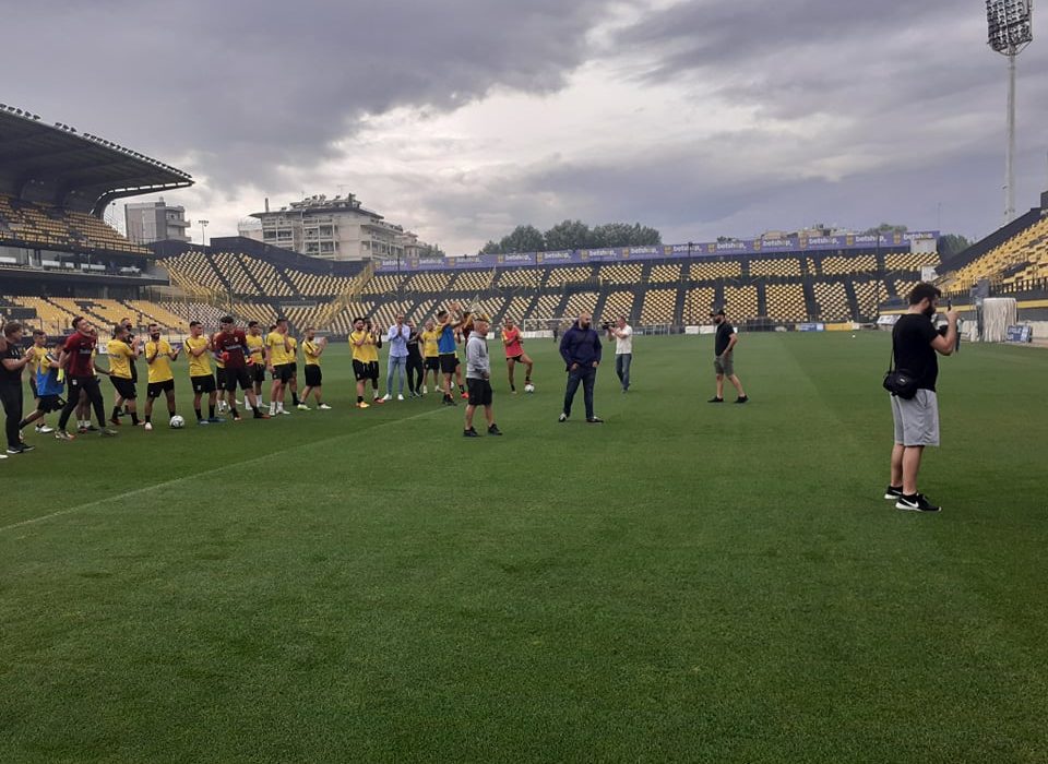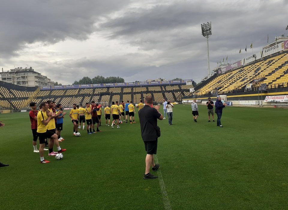 Οι ποδοσφαιριστές του Άρη χαιρέτησαν και χειροκρότησαν τον κόσμο της ομάδας που βρέθηκε σήμερα το απόγευμα στο γήπεδο προκειμένου να τους εμψυχώσει ενόψει του αυριανού ημιτελικού με την ΑΕΚ.