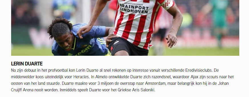 “Ο Ντουάρτε γρήγορα κέρδισε το ενδιαφέρον κορφυφαίων ομάδων της Ολλανδίας και τελικά διάλεξε την Χέρακλες. Εκεί εξελίχθηκε πάρα πολύ γρήγορα με αποτέλεσμα να πάει στον Άγιαξ για 3 εκατομμύρια, αλλά ποτέ δεν μπόρεσε να είναι σημαντικός εκεί. Σήμερα ο Ντουάρτε παίζει στην Ελλάδα για τον Άρη Θεσσαλονίκης.”