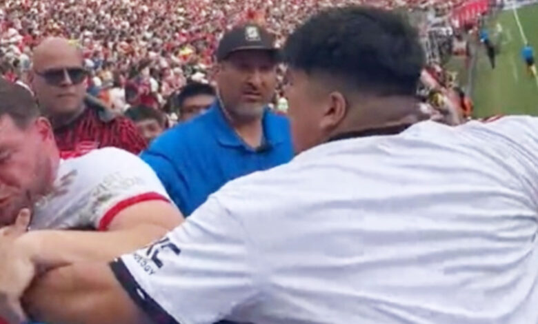 Ένταση που μεταφέρθηκε και στις κερκίδες με οπαδούς να έρχονται στα χέρια κατά τη διάρκεια της αναμέτρησης. Ενώ δεν είναι σαφές τι προκάλεσε τον καυγά, μια ομάδα οπαδών στη σκάλα που χωρίζει τις σειρές των καθισμάτων άρχισε να σπρώχνουν ο ένας τον άλλον πριν η κατάσταση κλιμακωθεί και αρχίσουν οι γροθιές.