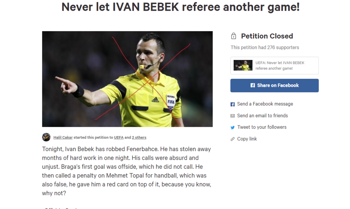 Μάλιστα μερικοί φίλοι της Φενέρμπαχτσε δεν έμειναν απλά στα λόγια, αλλά έφτιαξαν μια online αίτηση να μην οριστεί διαιτητής ξανά ο Μπέμπεκ σε κανένα ποδοσφαιρικό παιχνίδι, προσπαθώντας να μαζέψουν υπογραφές.