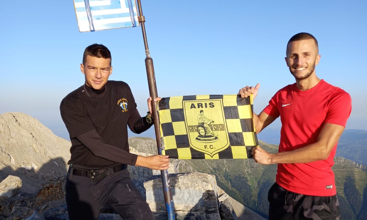 Σε αυτή τους την περιπέτεια είχαν πάντα μαζί τους και την σημαία της αγαπημένης τους ομάδας, του Άρη, με την οποία φωτογραφήθηκαν μόλις πάτησαν στην κορυφή.