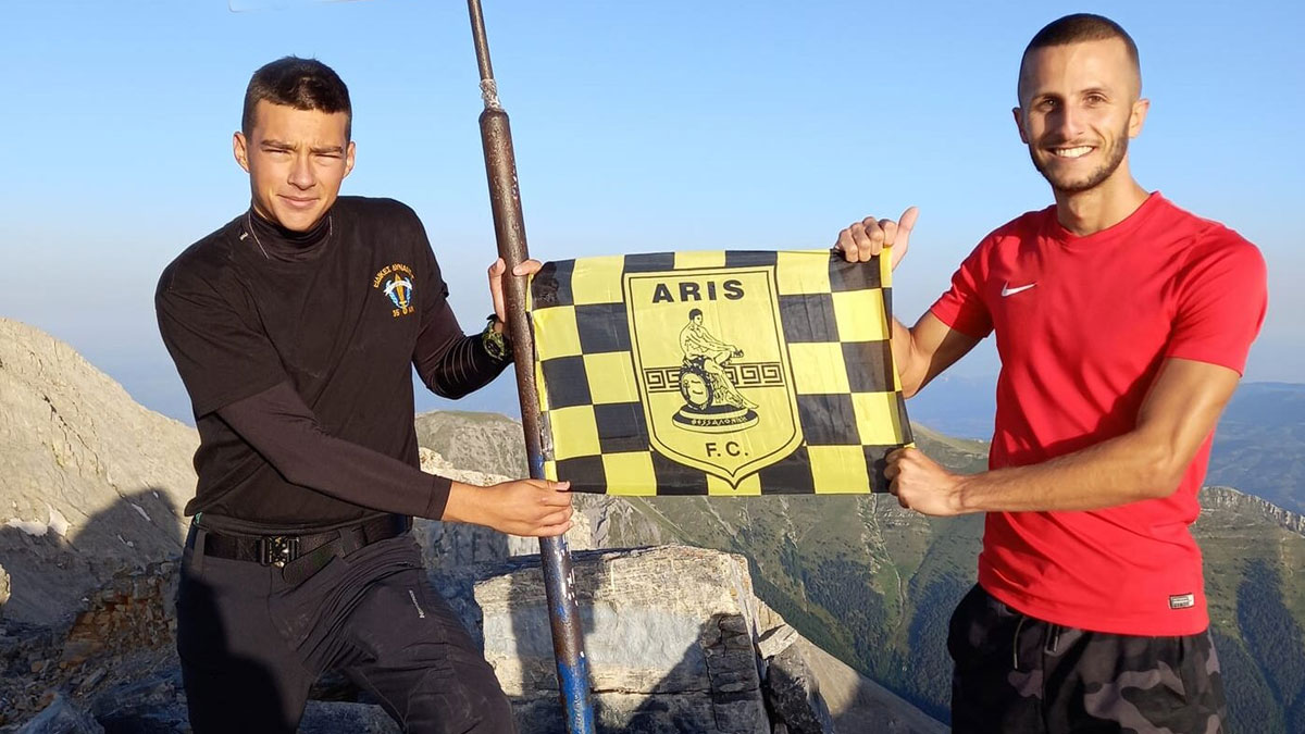 Σε αυτή τους την περιπέτεια είχαν πάντα μαζί τους και την σημαία της αγαπημένης τους ομάδας, του Άρη, με την οποία φωτογραφήθηκαν μόλις πάτησαν στην κορυφή.