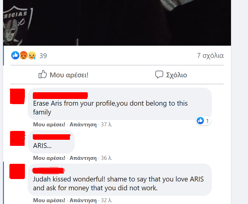 Οι φίλοι του Άρη μάλιστα δεν άφησαν αυτήν την… συνάντηση κορυφής ασχολίαστη. “Σβήσε το όνομα του Άρη από το προφίλ σου, δεν είσαι μέλος της οικογένειας” έγραψε φίλος της ομάδας σχολιάζοντας το ότι συνεχίζει να διατηρεί προφίλ με όνομα “Κριστάν Πορτίγια Άρης”, ενώ άλλος φίλος της ομάδας έγραψα ότι “Ο Ιούδος φιλούσε υπέροχα. Είναι ντροπή να λες ότι αγαπάς τον Άρη και να ζητάς λεφτά που δεν δούλεψες”.