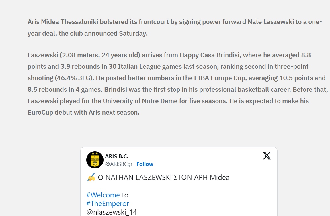 “Ο Λαζέφσκι (2,08, 24 ετών) προέρχεται από μια σεζόν στη Μπρίντιζι, όπου μέτρησε κατά μέσο όρο 8,8 πόντους και 3,9 ριμπάουντ σε 30 παιχνίδια στο Ιταλικό πρωτάθλημα, όντας στη δεύτερη θέση αποτελεσματικότητας πίσω από τα 6,75 (46,4%).