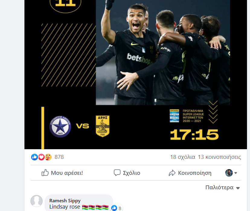 Αυτό έδειξε ένας συμπατριώτης του Λίντσεϊ Ροζ, ο Ραμές, ο οποίος κάτω από την φωτογραφία της ΠΑΕ Άρης για το ματς με Ατρόμητο σχολίασε «Λίντσεϊ Ροζ» και προσέθεσε δίπλα σημαίες της χώρα του Μαυρικίου.