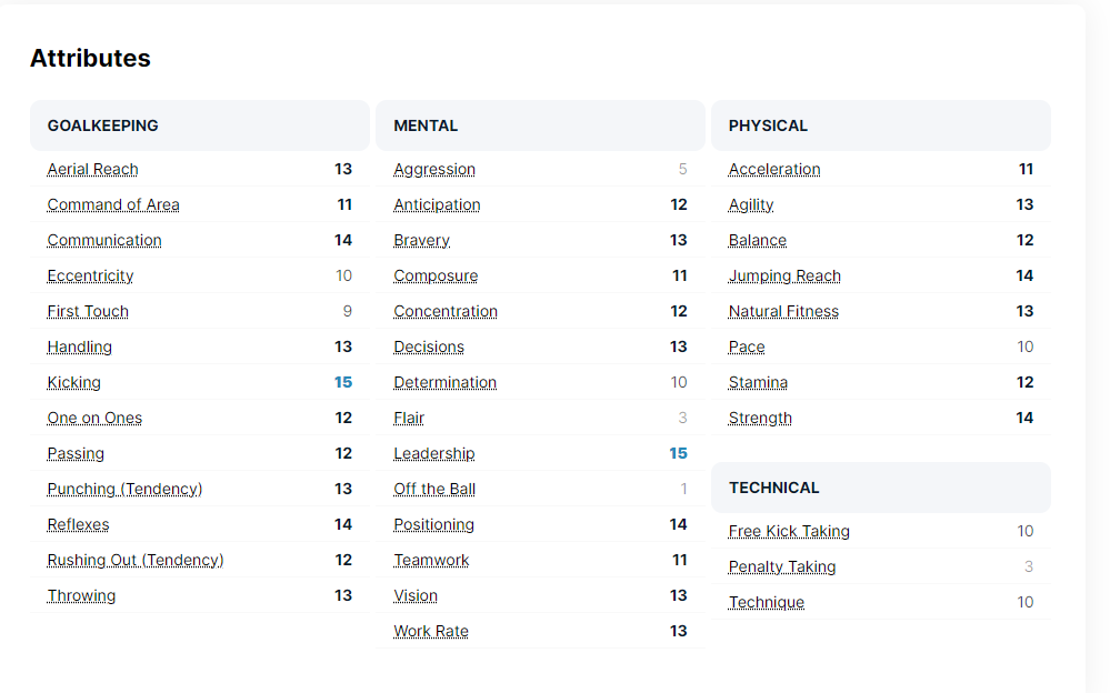 Στα καλύτερα του χαρακτηριστικά είναι η ικανότητα του να ηγηθεί αλλά και η επικοινωνία, ενώ αρκετά καλή βαθμολογία έχει και για το παιχνίδι που μπορεί να κάνει με τα πόδια.