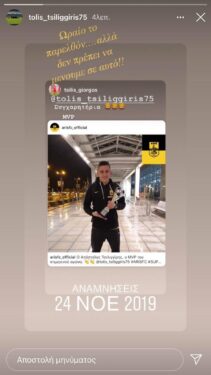 Ο Τσιλιγγίρης δημοσίευσε στον προσωπικό του λογαριασμό στο Instagram, τον ίδιο με το βραβείο του MVP με το σχόλιο: «Ωραίο το παρελθόν… αλλά δεν πρέπει να μένουμε σε αυτό».