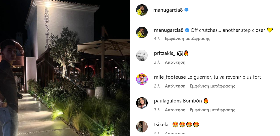 O Mάνου Γκαρθία συνεχίζει τον δικό του “αγώνα”, προκειμένου να ξεπεράσει τον σοβαρό τραυματισμό που είχε. Πλέον, έχει πετάξει τις πατερίτσες, όπως έκανε ο ίδιος γνωστό, γράφοντας μεταξύ άλλων “ένα βήμα πιο κοντά…”.