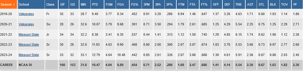Το 2021 μεταγράφηκε στο Missouri State. Σε 34 αγώνες μέτρησε 8.4 πόντους, 6.2 ριμπάουντ και 1.7 ασίστ. Το 2022-23 είχε 11.9 πόντους, 5.5 ριμπάουντ και 3.6 ασίστ, ενώ στην τελευταία κολεγιακή χρονιά του, το 2023-24, μέτρησε 12.8 πόντους, 5.9 ριμπάουντ και 2.4 ασίστ.
