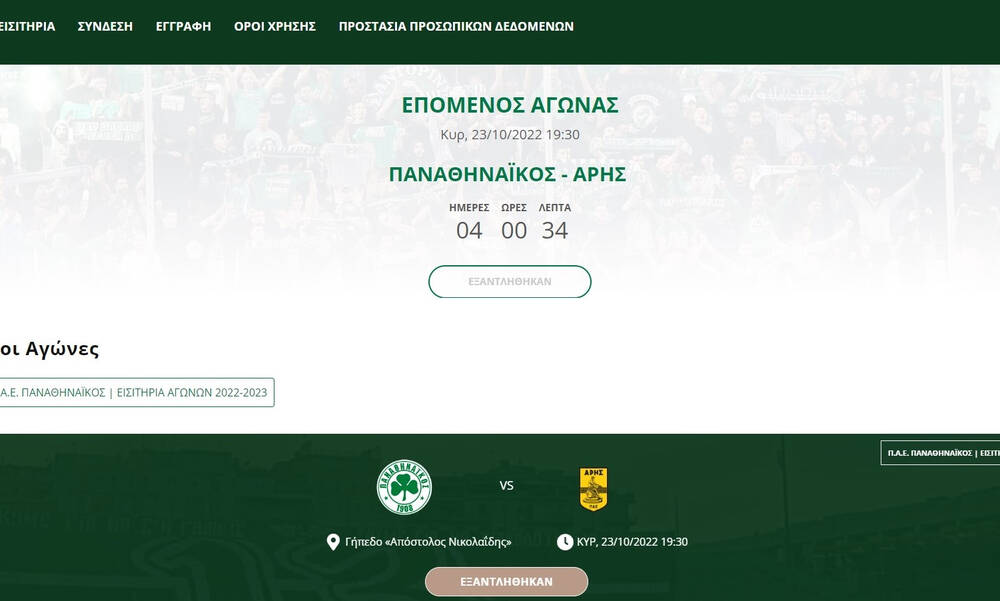 Κατάμεστη θα είναι η Λεωφόρος στην αναμέτρηση του Παναθηναϊκού με τον Άρη για την 9η αγωνιστική. Όποιος επισκέπτεται την ιστοσελίδα πώλησης των εισιτηρίων, συναντά το μήνυμα «εξαντλήθηκαν». Παρακάτω η σχετική φωτογραφία