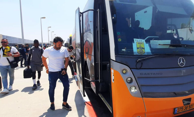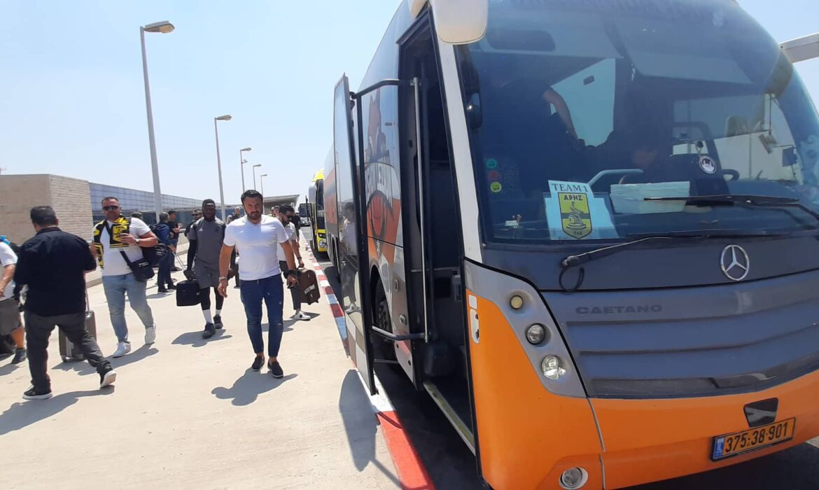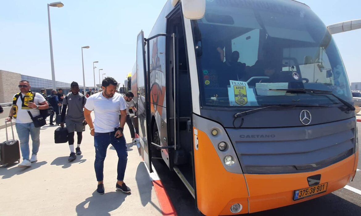 Δύο πούλμαν περίμεναν το τσάρτερ του Άρη μετά και την άφιξή τους στο αεροδρόμιο του Τελ Αβίβ, ένα για την ομάδα του Άρη και ένα για τους φίλους του Θεού του Πολέμου.