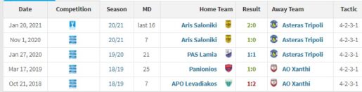 Ο προπονητής των κιτρινόμαυρων, τον κέρδισε ως προπονητής του Πανιωνίου, ενώ έχει και μία ισοπαλία όταν ήταν στον πάγκο της Λαμίας.