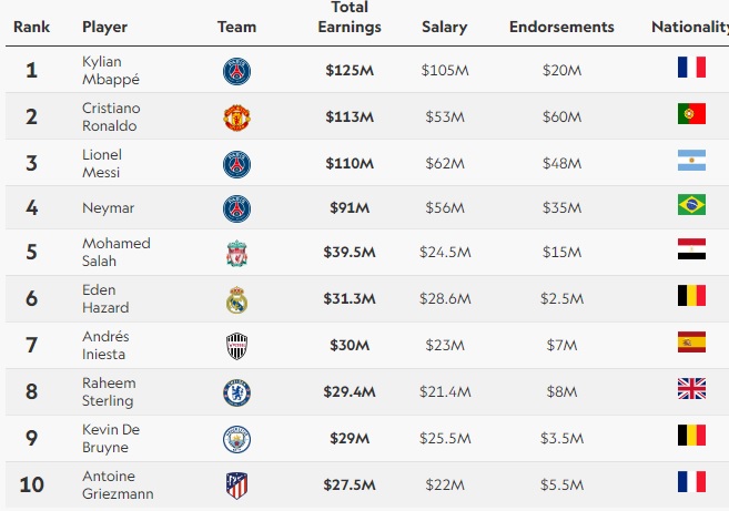 Στην πρώτη θέση της λίστας των ποδοσφαιριστών με τα περισσότερα έσοδα για το 2022, φιγουράρει ο Κιλιάν Εμπαπέ, αφήνοντας πίσω του, τους Κριστιάνο Ρονάλντο κα Λιονέλ Μέσι που ακολουθούν στη 2η και 3η θέση αντίστοιχα.
