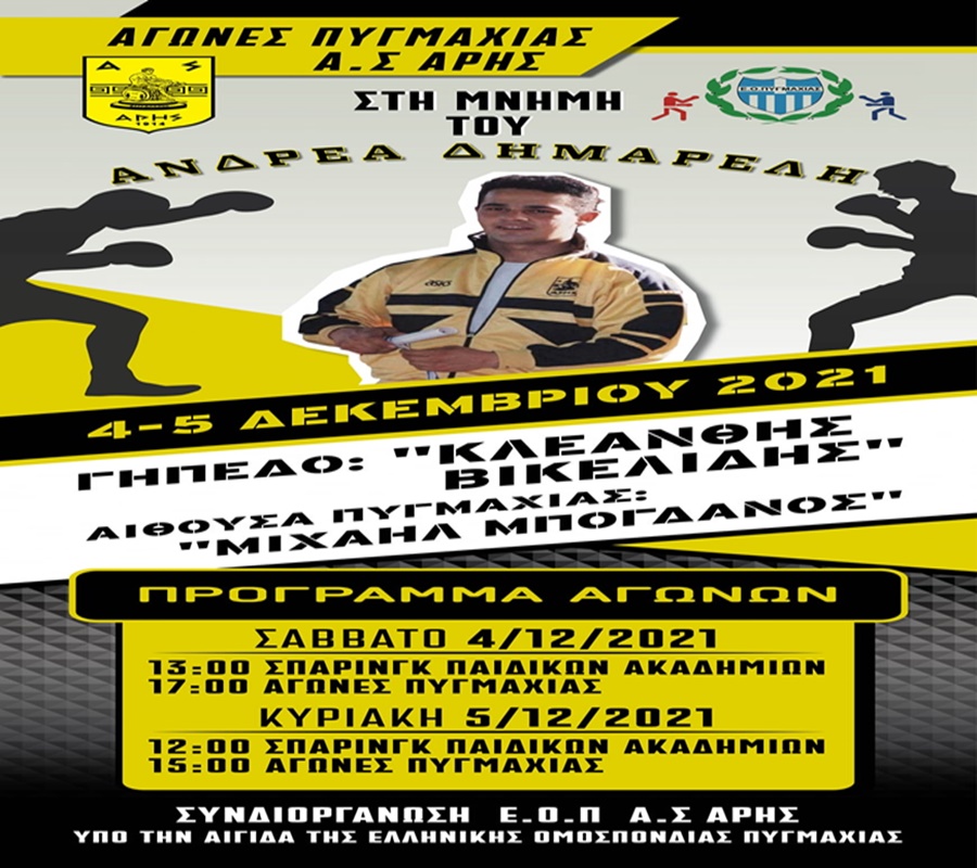 Ο Α.Σ. Άρης και το τμήμα Πυγμαχίας ανακοινώνουν ότι υπήρξε αλλαγή ημερομηνίας στο Κύπελλο Πυγμαχίας, το οποίο θα διοργανωθεί υπό την αιγίδα της Ελληνικής Ομοσπονδίας Πυγμαχίας στη μνήμη του Ανδρέα Δημαρέλη, που πρόσφατα «έφυγε» από τη ζωή.