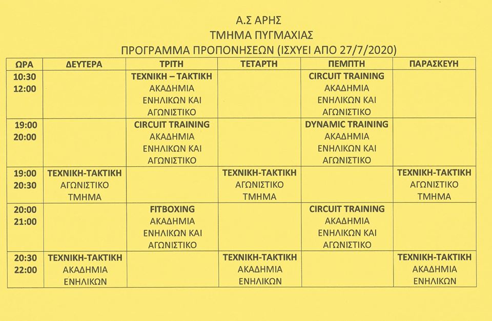 Ο Α.Σ. ΑΡΗΣ και το τμήμα Πυγμαχίας ενημερώνουν ότι από τη Δευτέρα 27/07 θα ισχύσει νέο πρόγραμμα προπονήσεων για τους αθλητές του συλλόγου.