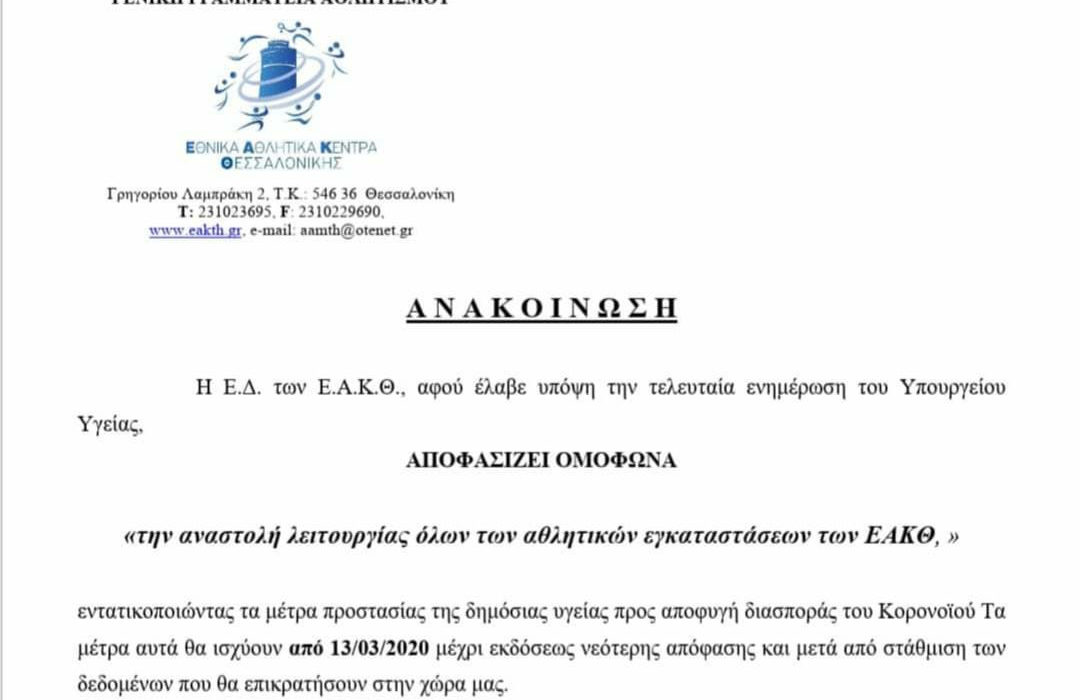Το τμήμα υδατοσφαίρισης του Α.Σ. ΑΡΗΣ ανακοινώνει την αναστολή κάθε δραστηριότητας αθλητικής και μη από σήμερα 12-3 και επ αόριστον, σύμφωνα με την οδηγία της Γ.Γ.Α. που αποσκοπεί στην πρόληψη διάδοσης του Κορονοϊού.