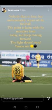«Σε κανέναν δεν αρέσει να χάνει, όμως δυστυχώς αυτό η ήττα είναι μέρος του ποδοσφαίρου. Σημασία έχει να μαθαίνουμε από τα λάθη και να συνεχίζουμε! Η μάχη δεν έχει σταματήσει. Vamos Aris!»