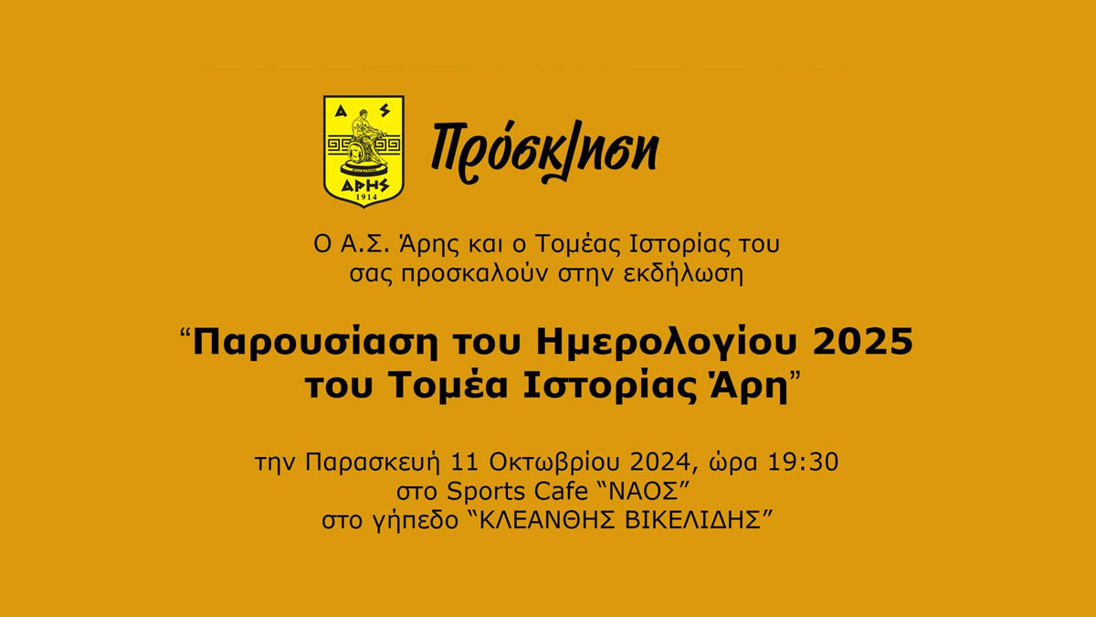 Σήμερα (11/10) στις 19:30 θα πραγματοποιηθεί η πολυαναμενόμενη εκδήλωση του Τομέα Ιστορίας του Άρη στον χώρο του καφέ «ΝΑΟΣ», στο γήπεδο «Κλεάνθης Βικελίδης».