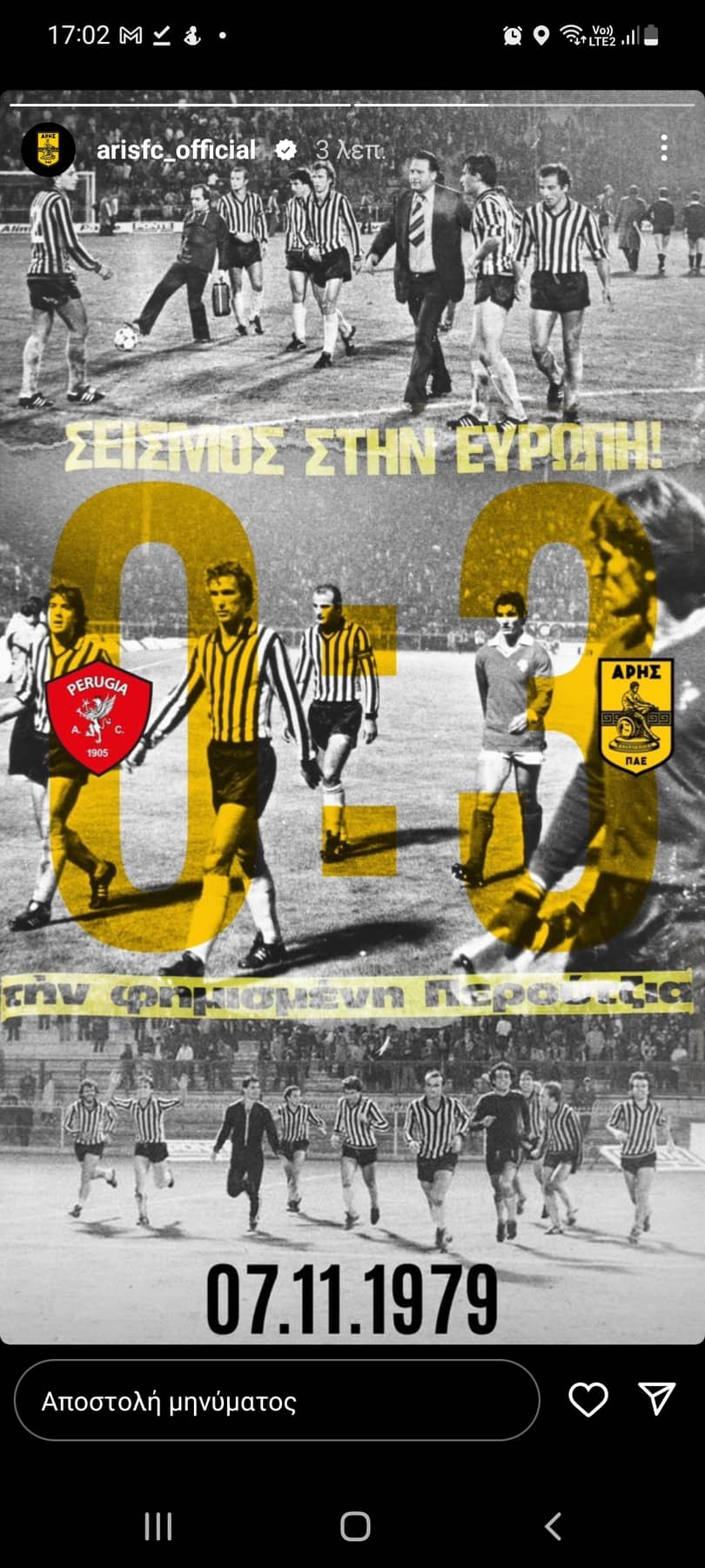 Σήμερα συμπληρώνονται 43 χρόνια από μία μεγάλη ευρωπαϊκή επιτυχία του Άρη, όταν επικράτησε επί της ισχυρής Περούτζια επί ιταλικού εδάφους με 0-3.