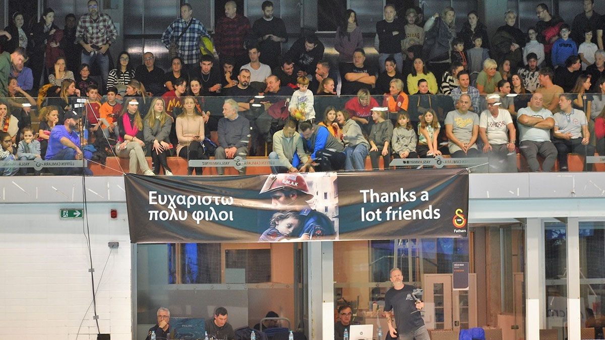 «Ευχαριστούμε πολύ φίλοι»! Το συγκινητικό πανό που σήκωσαν λίγο πριν την έναρξη του 2ου Προημιτελικού του Challenger Cup στο κολυμβητήριο «Engin Bora Waterpolo Pool» της Κωνσταντινούπολης οι φίλαθλοι της Γαλατασαράι και το οποίο απεικόνιζε ένα παιδάκι από την Τουρκία στην αγκαλιά ενός Έλληνα διασώστη.