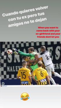 Ο τερματοφύλακας των “κιτρινόμαυρων” ανάρτησε στον προσωπικό του λογαριασμό στο Instagram ένα στιγμιότυπο του αγώνα που αποκρούει την μπάλα από την εστία με την βοήθεια των συμπαικτών του. Ο Ισπανός λόγω της έντασης της φωτογραφίας δίνει έναν χιουμοριστικό τόνο γράφοντας “Όταν θες να τα ξαναβρείς με την πρώην κοπέλα σου και οι φίλοι σου δεν σε αφήνουν”.
