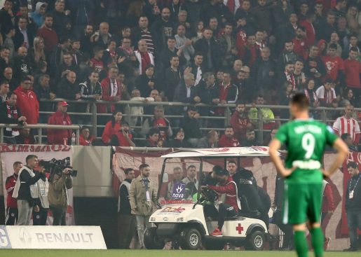 Συγκλονιστικές στιγμές στο «Γ. Καραϊσκάκης» τη στιγμή του τραυματισμού του Σωκράτη Διούδη, που έκανε όλο το γήπεδο να «παγώσει».
